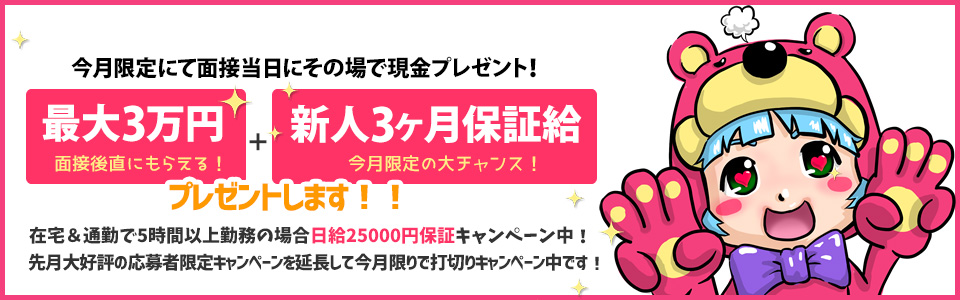 今月のみ応募登録をして頂いた女性には新人保証キャンペーン中として3万円プレゼント!