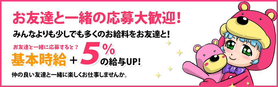 今月のみ限定にてお友達と一緒に応募すると給与が5%UP!するキャンペーン中!